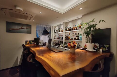 2019年施工現場のバーSaikaiにお邪魔して写真を撮らせてもらいました! 一枚板の存在感がしっか...