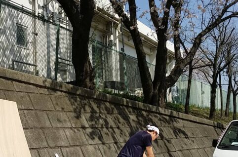 天気がよく桜の下でやってます!