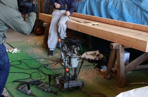 化粧のタイコ梁を設計の方がカンナがけしています。